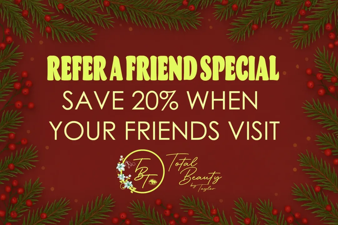 Share the gift of gorgeous lashes and beautiful hair this holiday season! When you refer a friend to Total Beauty By Taylor in Cañon City and they come in for a service, you will receive 20% off your next appointment.